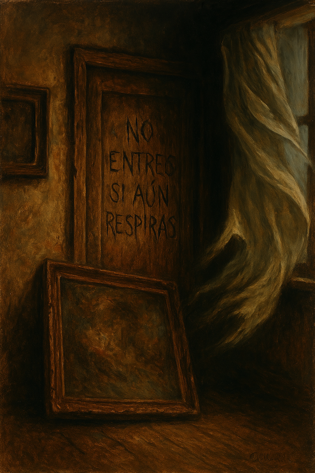 The air smelled of dust and linseed oil. In the background, a frigid draft stirred a curtain, revealing a door hidden behind a fallen painting. Hand-carved into the wood were crooked, profound words: "DO NOT ENTER IF YOU STILL BREATH."