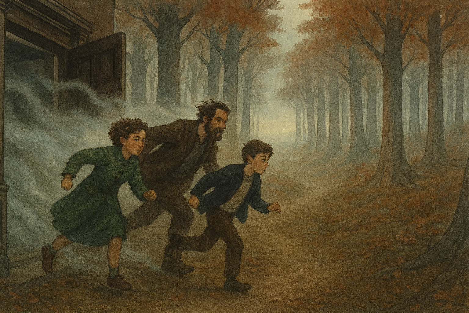 The three of them managed to run toward the front door, pursued by a freezing wind that roared like a wail. As they crossed the threshold, the air changed. Outside, it was no longer night, but a gray dawn. The forest stretched silently, but something didn't fit: the trees seemed larger, the path different.