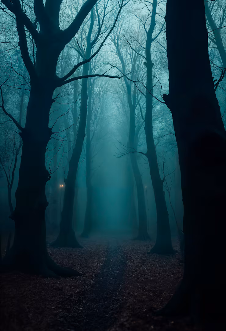 → A narrow trail covered in pumpkins that glow with an eerie light.